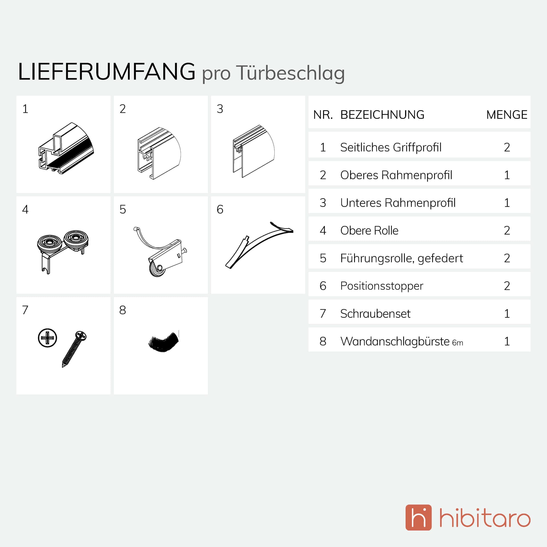 | Inkl. Schienen, Rahmenprofile und Rollen (Türfüllung in Weiß kann optional dazu ausgewählt werden) |