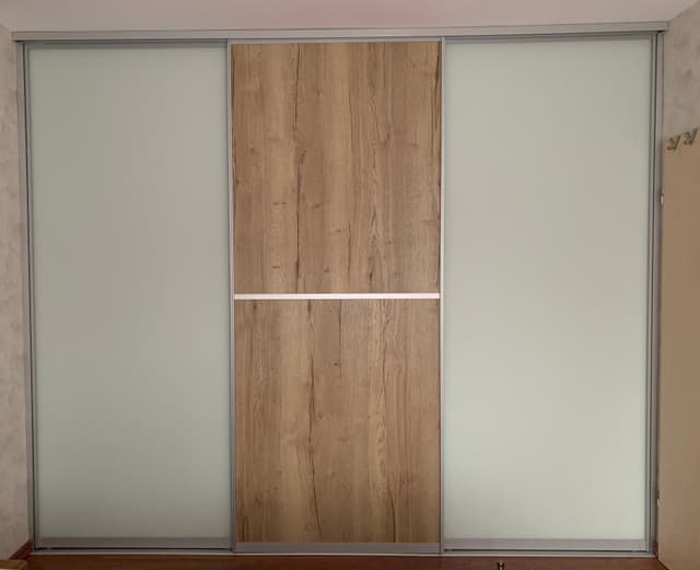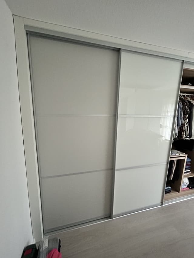 Sie müssen nun die Laufschienen anbringen, die Rahmenprofile (ggfs. noch zuschneiden) umlaufend an der Türfüllung montieren, die Rollenbeschläge einsetzen und die fertigen Türen einstellen.