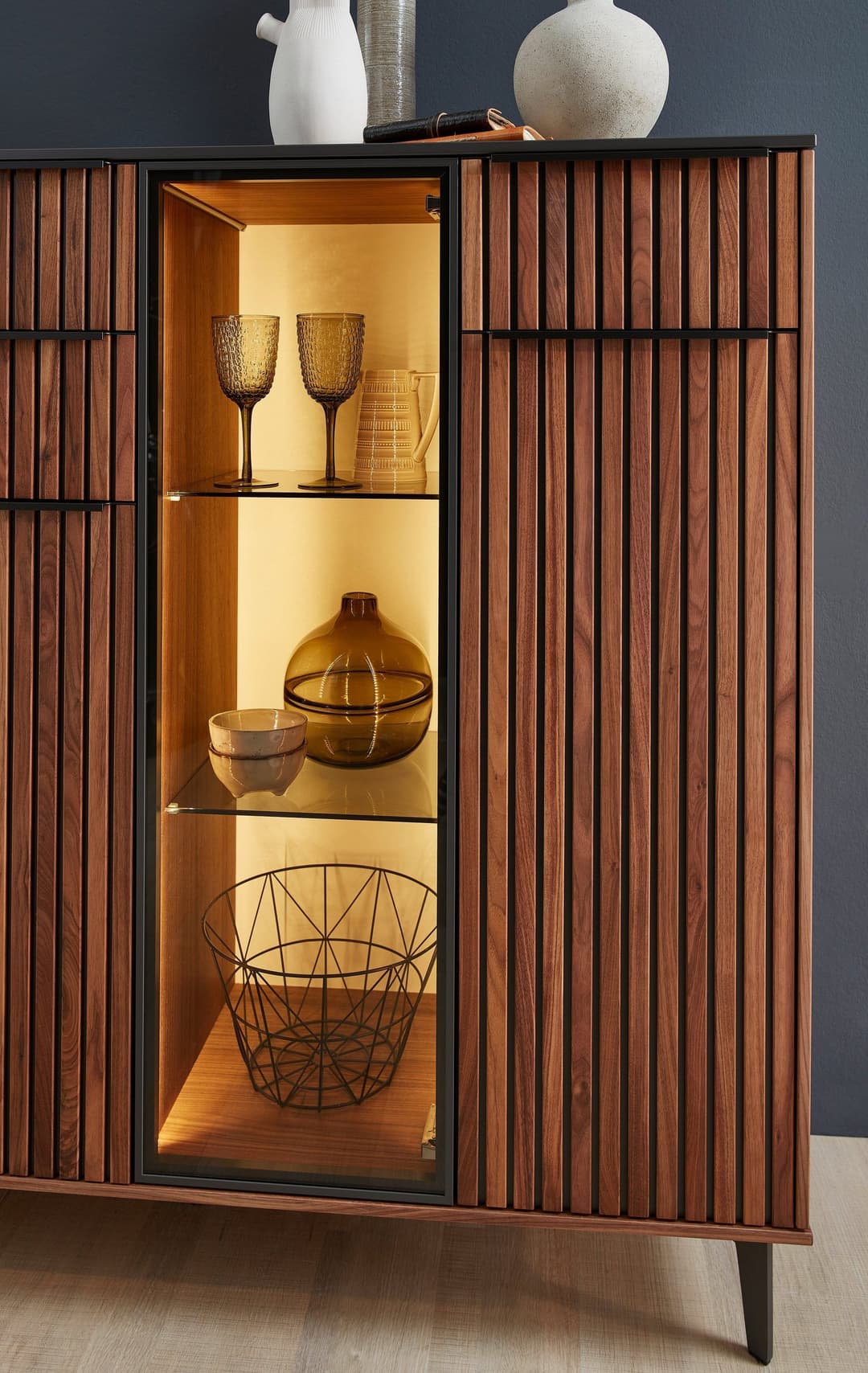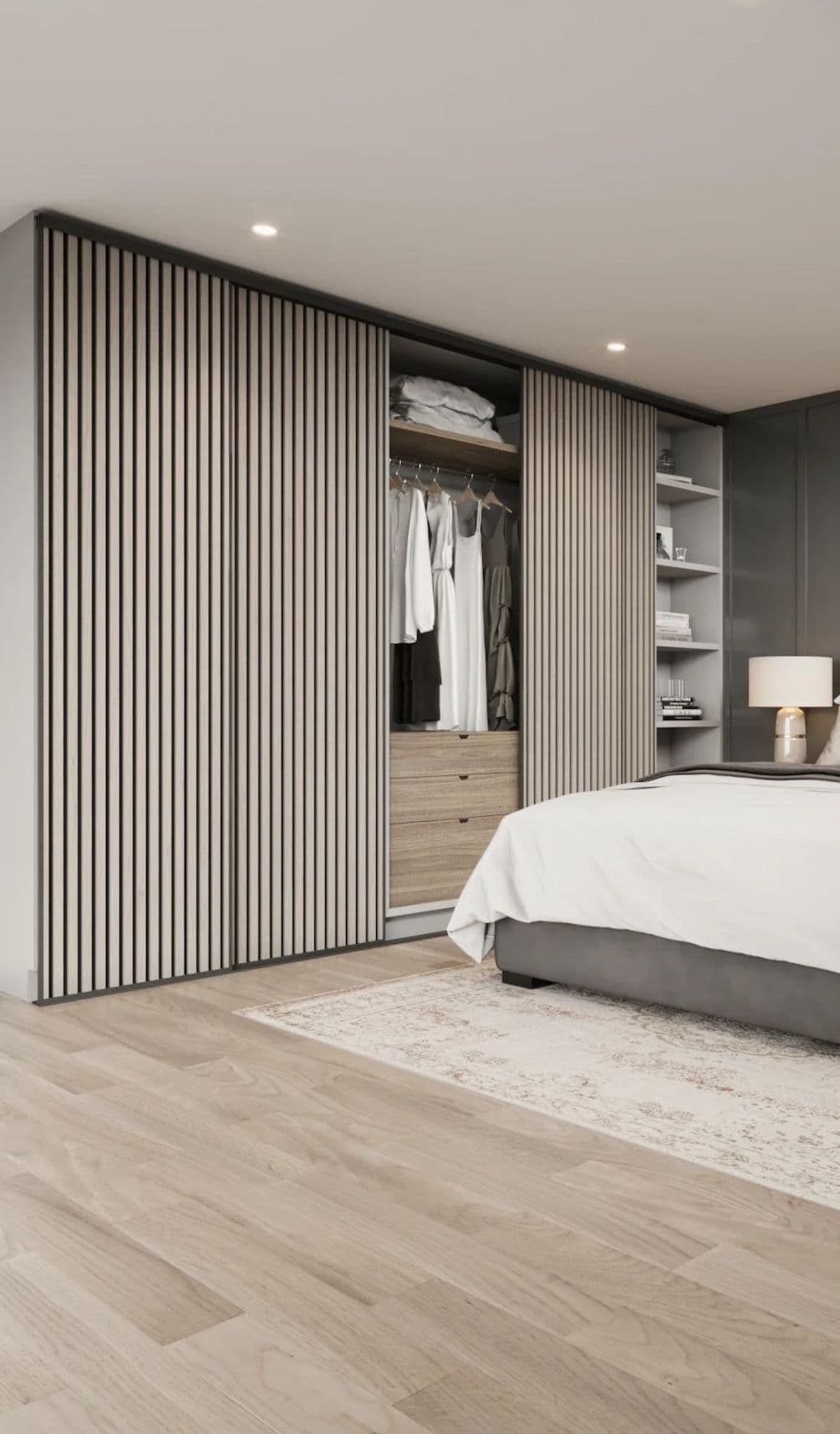Im Wohnbereich können auch Kleiderschränke, Sideboards und Lowboards mit den Paneelen in Lamellenoptik harmonieren. Gerade in Kombination mit dunkler Wandfarbe geben sie einen schönen, natürlichen Look ab: egal, ob der komplette Schrank mit den Paneelen verkleidet wird oder man nur einige optische Akzente setzt. Schränke können Sie direkt mit Schiebetüren von hibitaro ausstatten, um diese optisch aufzuwerten.