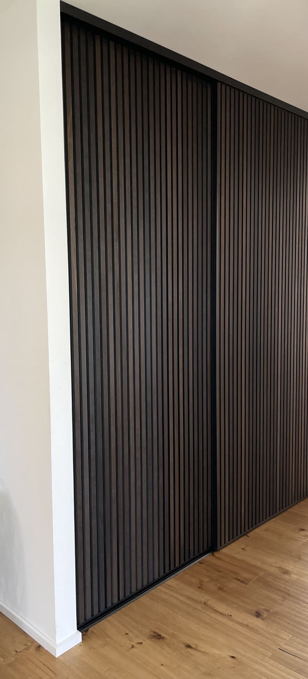 Die Akustikpaneele von hibitaro lassen sich nicht nur für die Wandgestaltung einsetzen. Weltweit exklusiv bieten wir auch Schiebetüren aus Akustikpaneelen an. Unsere Schiebetüren mit Lamellenpaneelen verleihen Räumen einen gemütlichen Touch. Die Verwendung von natürlichen Materialien wie Holz sorgt auch im Winter für ein warmes Raumgefühl. In Kombination mit unseren umlaufenden, schwarzen Aluminiumprofilen eignen sich die Türen als Schrank- und Nischenschiebetüren, z. B.
