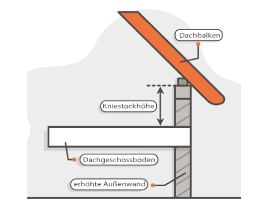 - Kniestock: Bei Dachschrägen mit Kniestock beginnt die Schräge idealerweise bei einer Höhe von 40–80 cm, da das Dach auf einer Außenwand aufliegt.