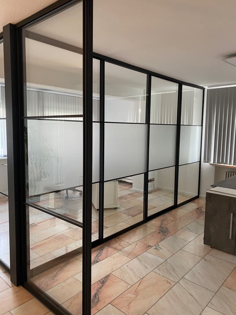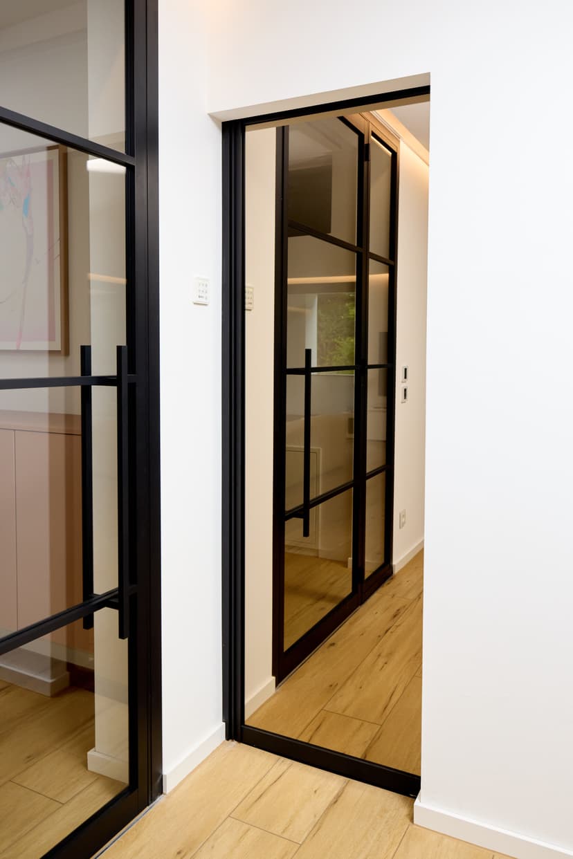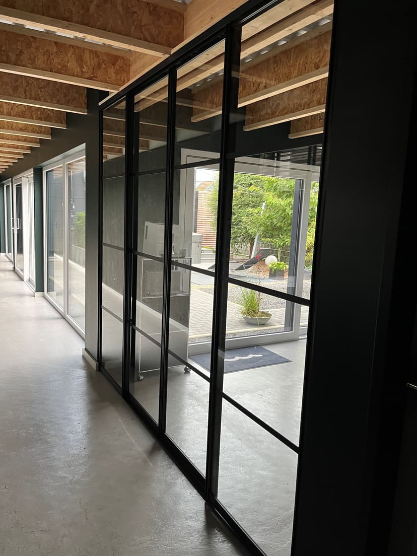 Glasschiebetür mit umlaufendem schwarzen Stahlrahmen in Loftoptik