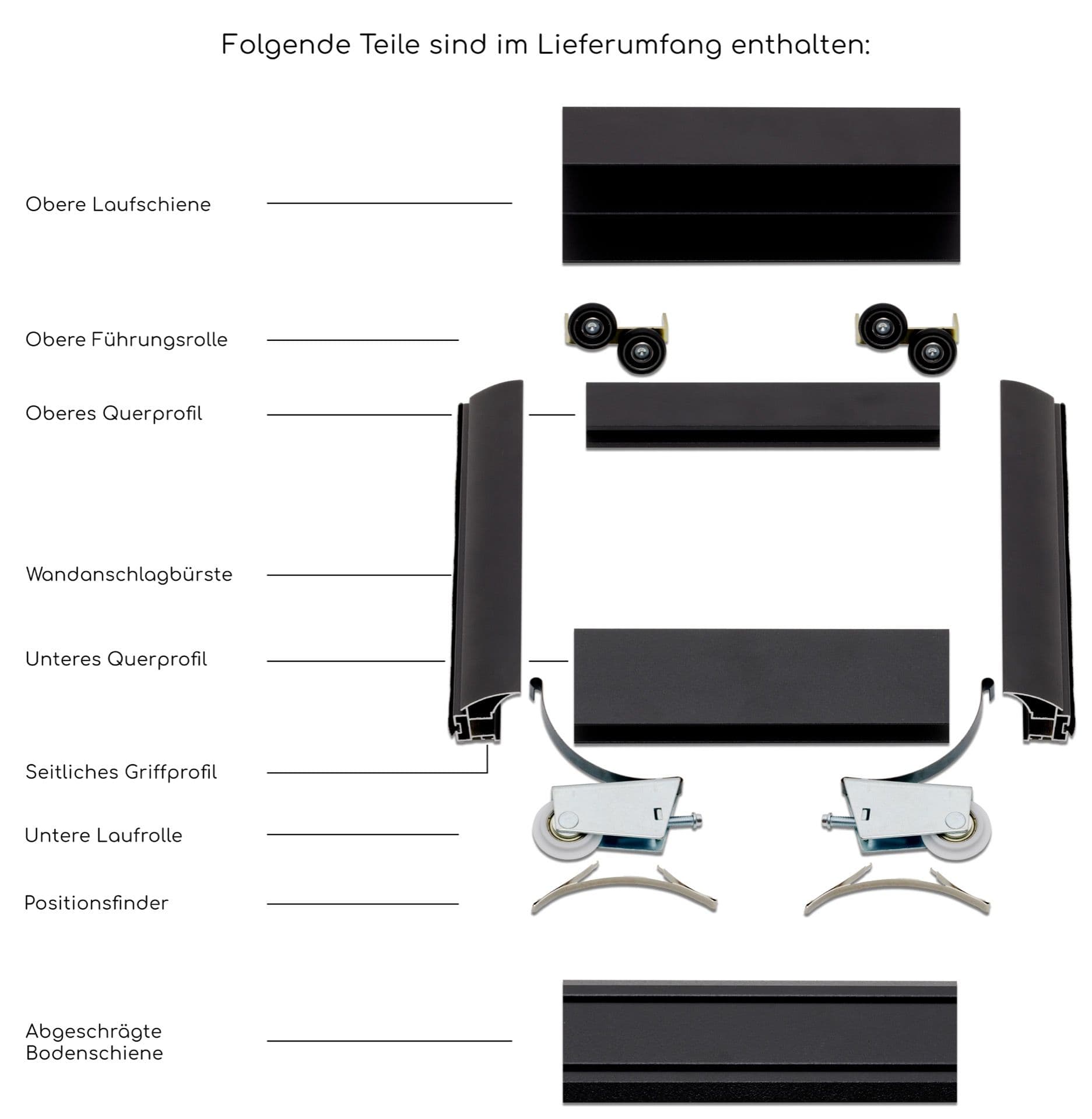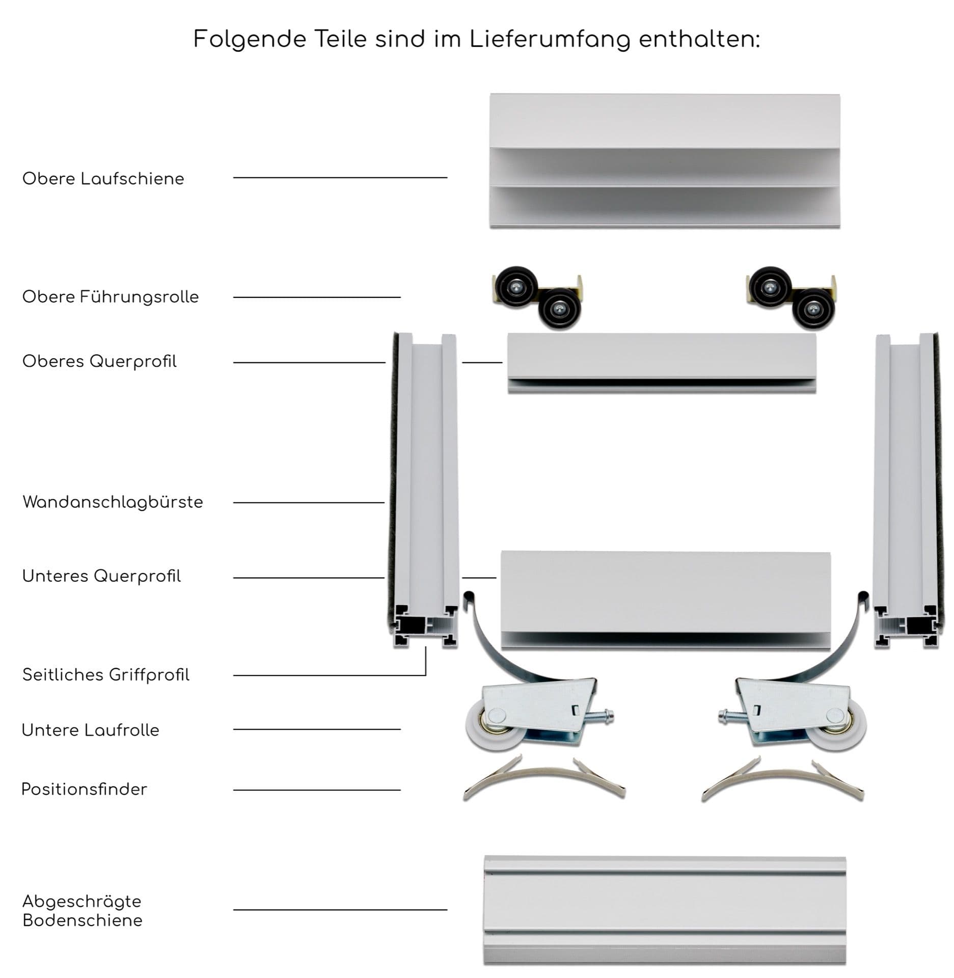 Inkl. Schienen, Griffprofile, Drempelhalter und Rollen