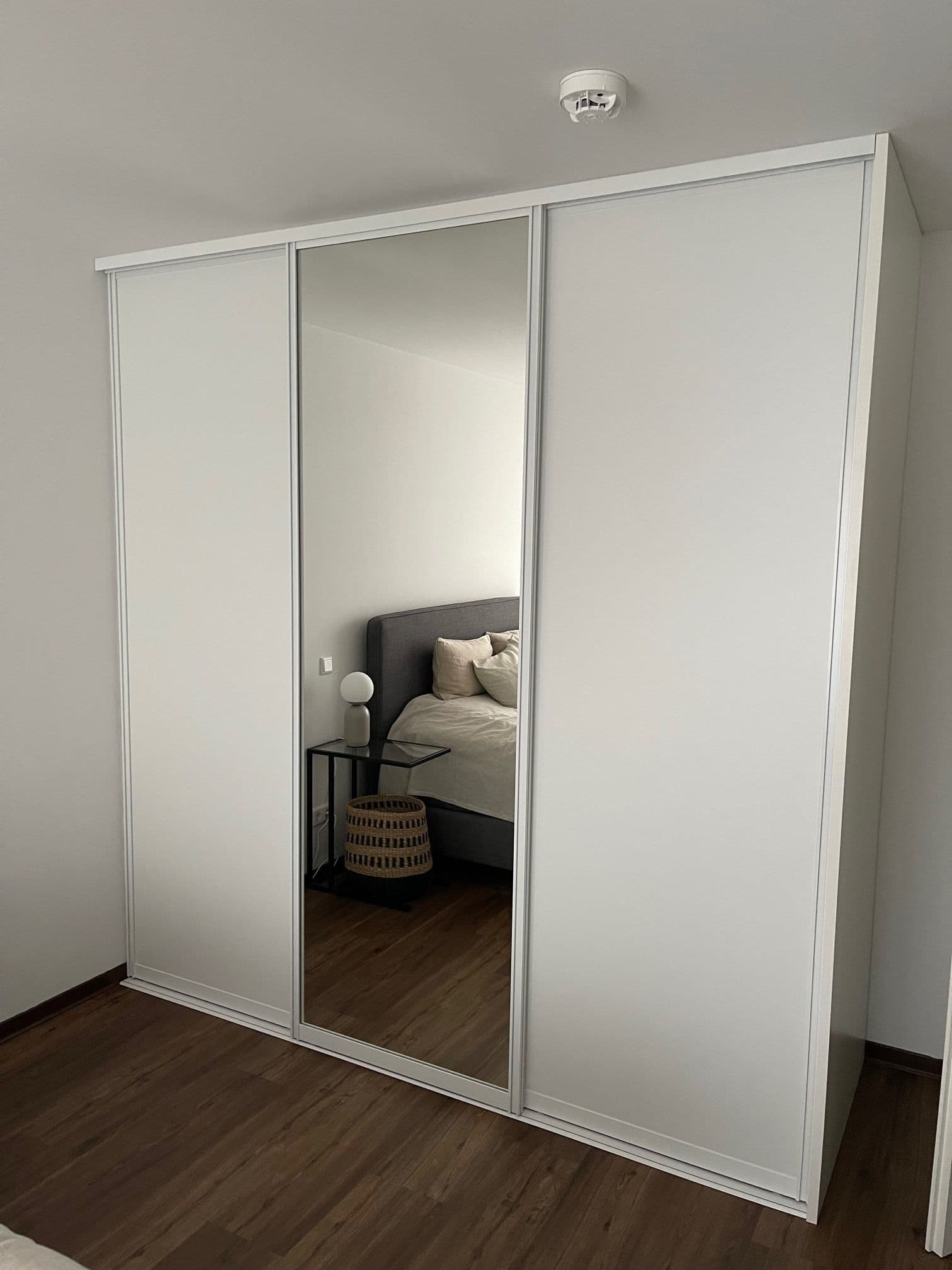 Weiße Holzschiebetüren mit U-Profilen unter Dachschrägen