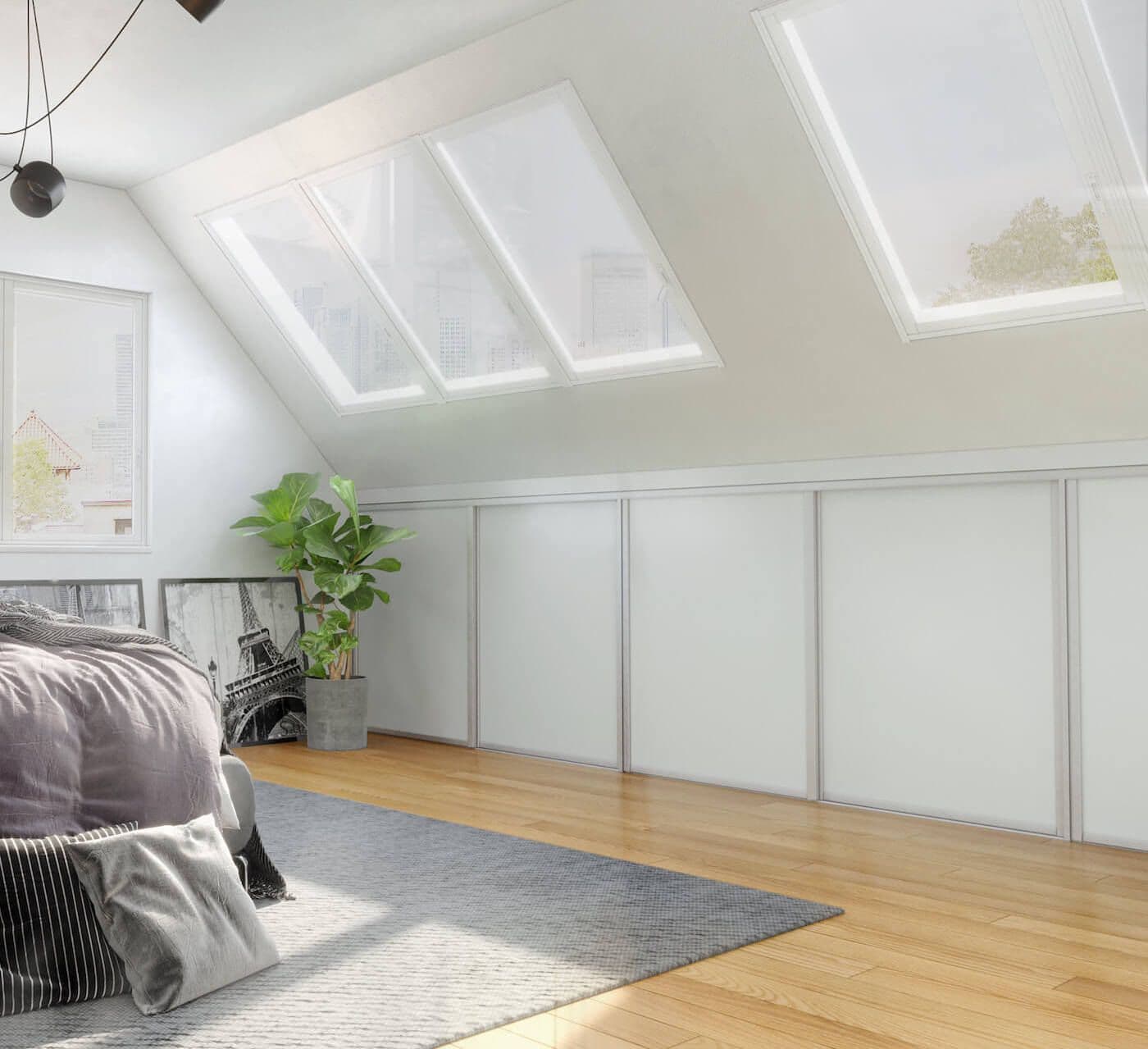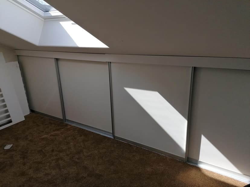 Weiße Holzschiebetüren mit U-Profilen unter Dachschrägen