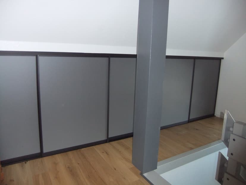 Dunkelgraue Holzschiebetüren unter Dachschrägen