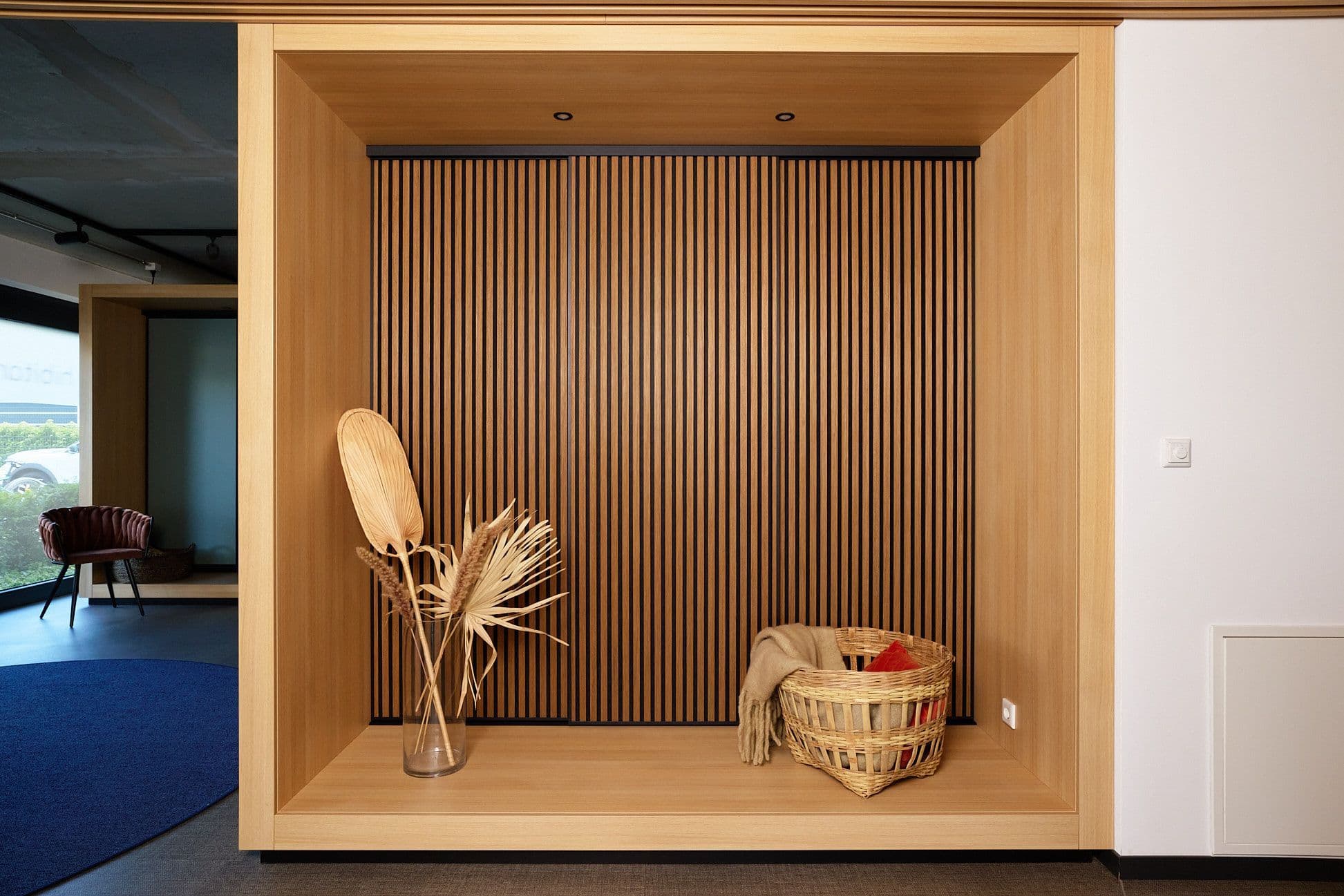 - Füllungen: Akustikpaneele bestehen aus einer Filzplatte welche mit Echtholzfurnierten MDF Holzstreifen versehen werden (Schallabsorbationsklasse A)