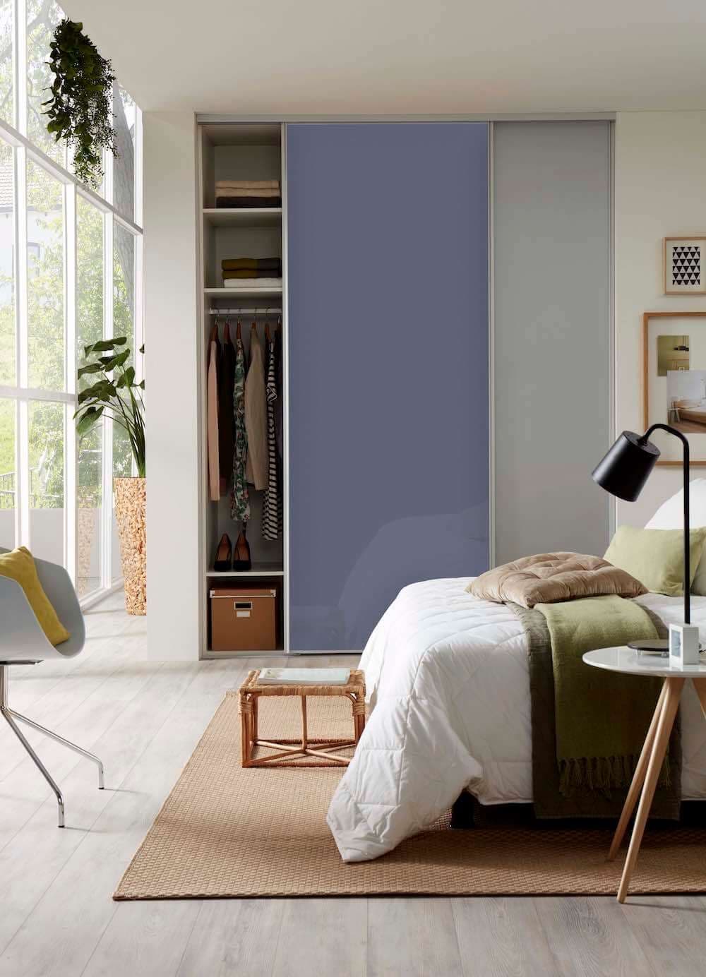 Selbst ausgefallene Füllungsvarianten sind bei Schiebetüren möglich (hier: lackiertes Glas in Blau-Grau / RAL-7000)