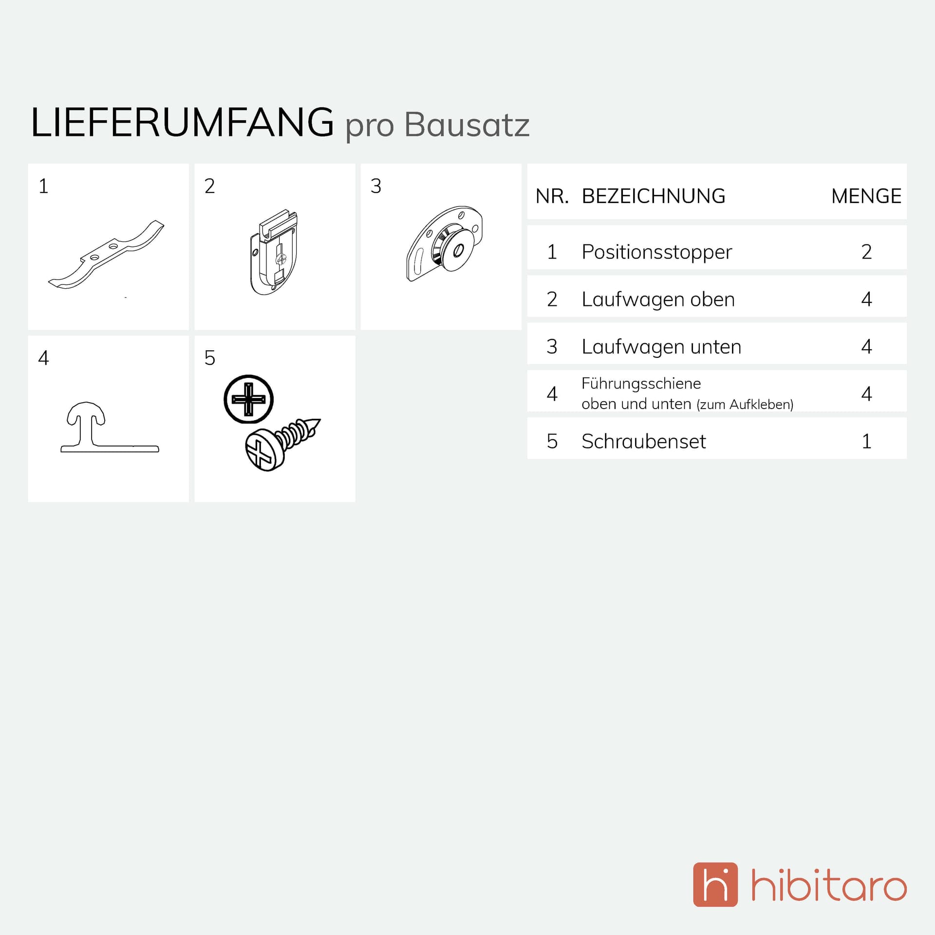 Bausatzart | Inkl. Schienen und Rollen (Ohne Türfüllung - Kann im Zubehör dazu bestellt werden) |